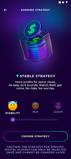 Мой куратор курса подсказал после регистрации в приложение выбрать из трех стратегий - Stability. Объяснив тем, что там больше выпадет токенов за просмотр ленты, но и меньше боксов. Но честно сложновато было понять🙈